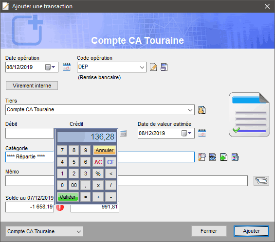 La saisie des montants pouvant se faire à l’aide de la calculatrice intégrée