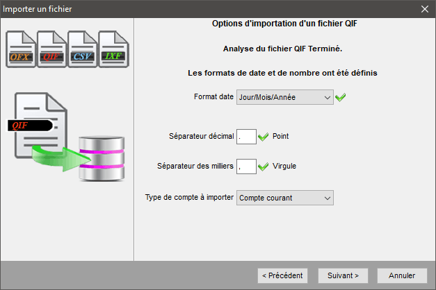 Lorsque vous importez un fichier QIF par exemple, le format des dates ou des nombres peut varier. La date peut