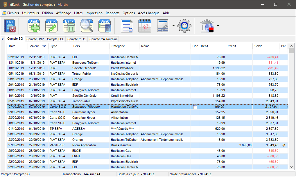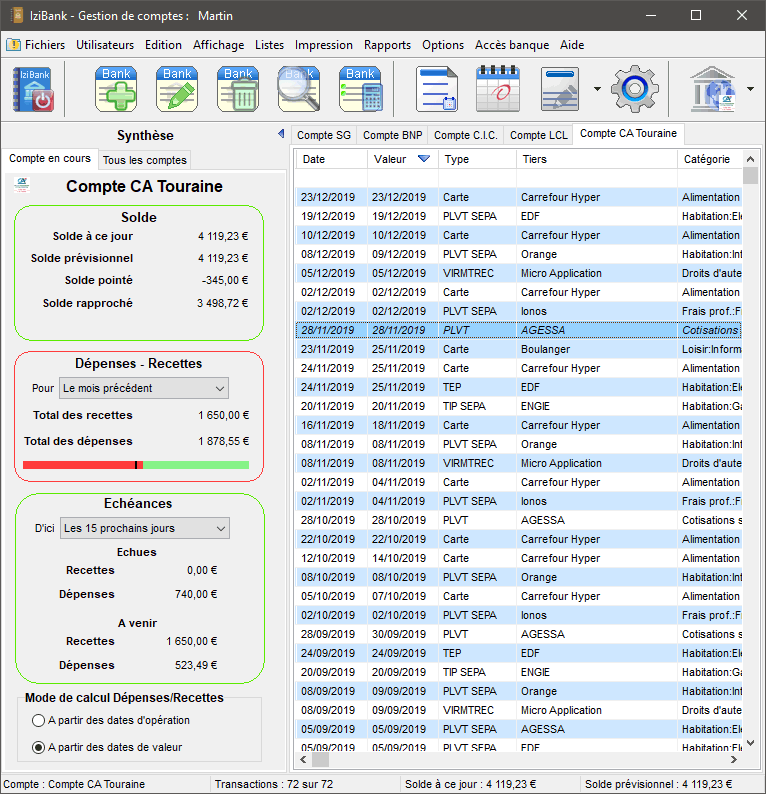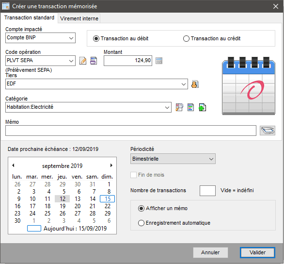 Afin de faciliter la saisie des transactions, il est possible de mémoriser les transactions répétitives comme les loyers, les salaires, les abonnements etc.