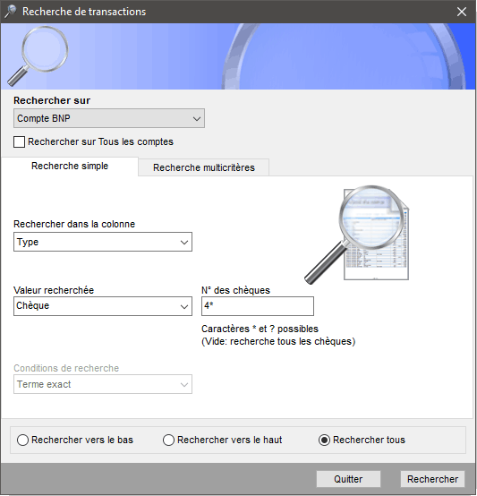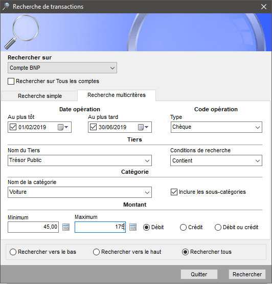 La recherche peut se faire de manière séquentielle vers le haut ou vers le bas, le curseur est alors déplacé sur le relevé sur chaque correspondance trouvée.